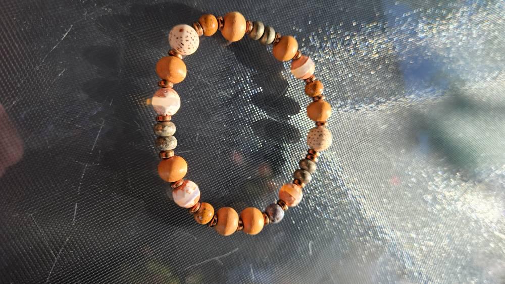 This bohemian elegant bracelet features Natural Sandalwood, Lotus Seeds and a mix of Pyrite and Ceramic beads, and copper accents.