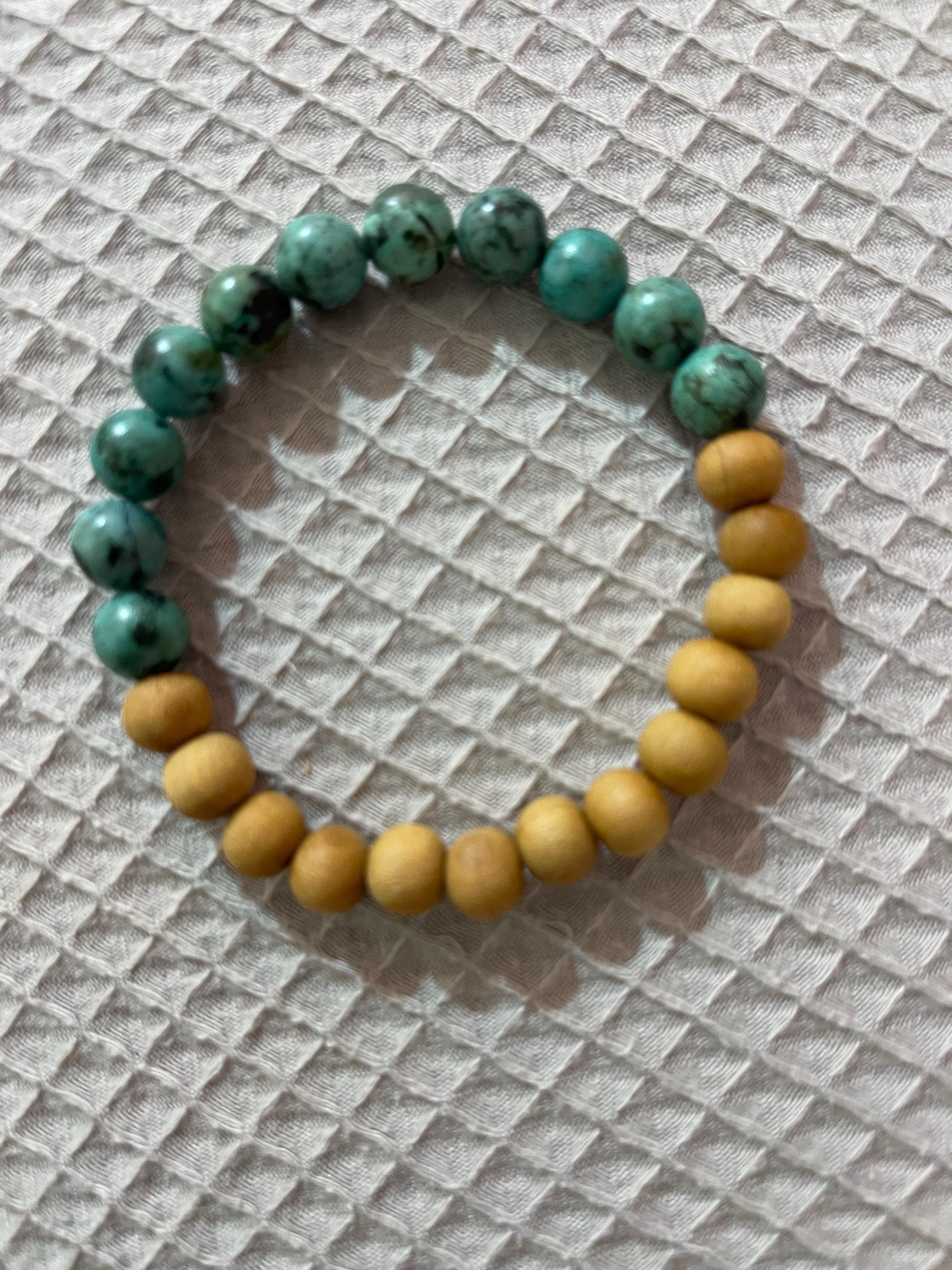 This bracelet is uniquely composed of African Turquoise and Sandalwood.